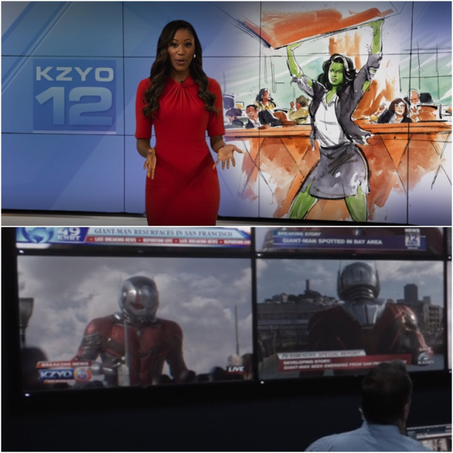 泰坦尼亞大鬧法庭,迫使女浩克意外現身,造成新聞媒體爭鋒報導。其中這家新聞台 KZYO 曾經在《蟻人與黃蜂女》中報導蟻人在海上變大的消息。而這些主播實際上都是迪士尼旗下 abc 新聞台的主播。