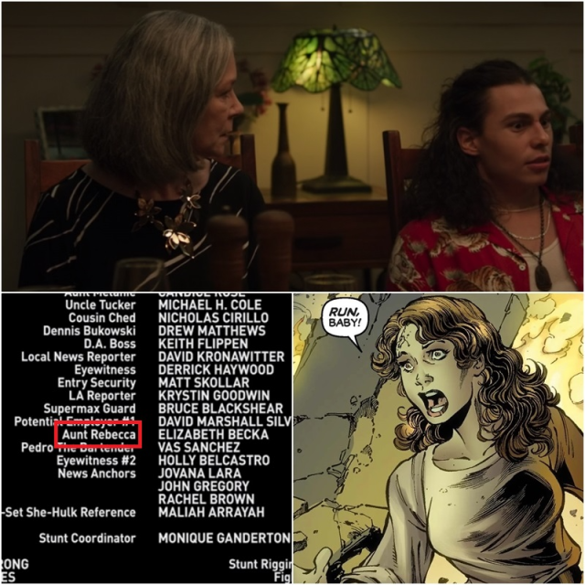 珍妮佛的家人知道她是新的超級英雄後,在餐桌前大聊復仇者聯盟和布魯斯的事情。其中有一位女士,根據片尾得知名為 蕾貝卡阿姨 (Aunt Rebecca),也就是班納的母親。