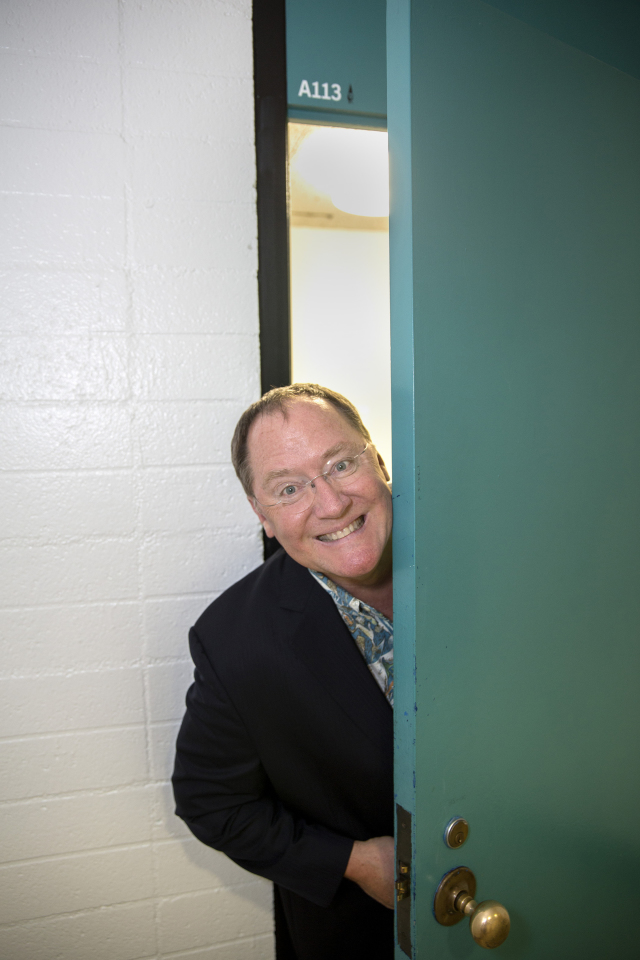 ▼皮克斯元老 John Lasseter 返回母校與A113教室合影。