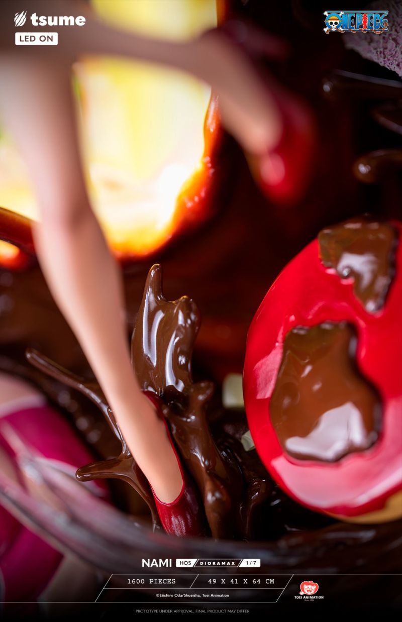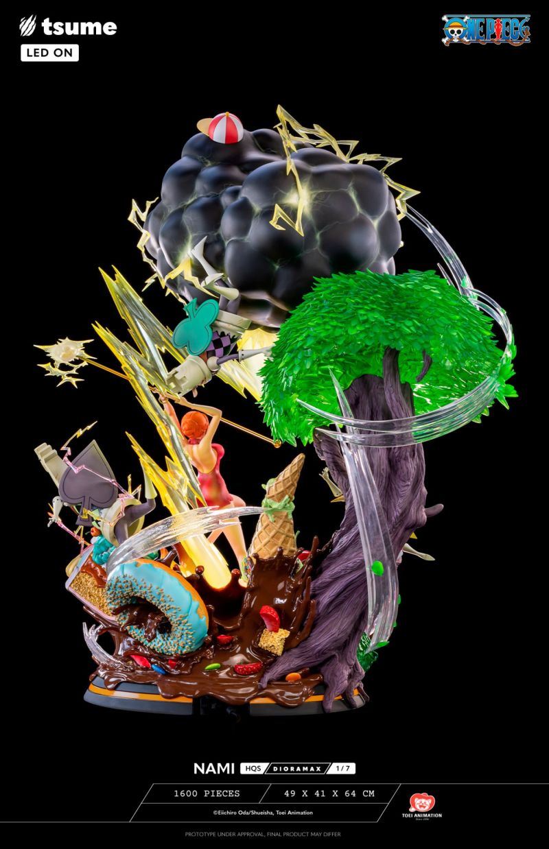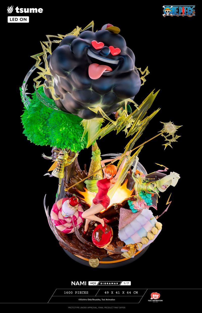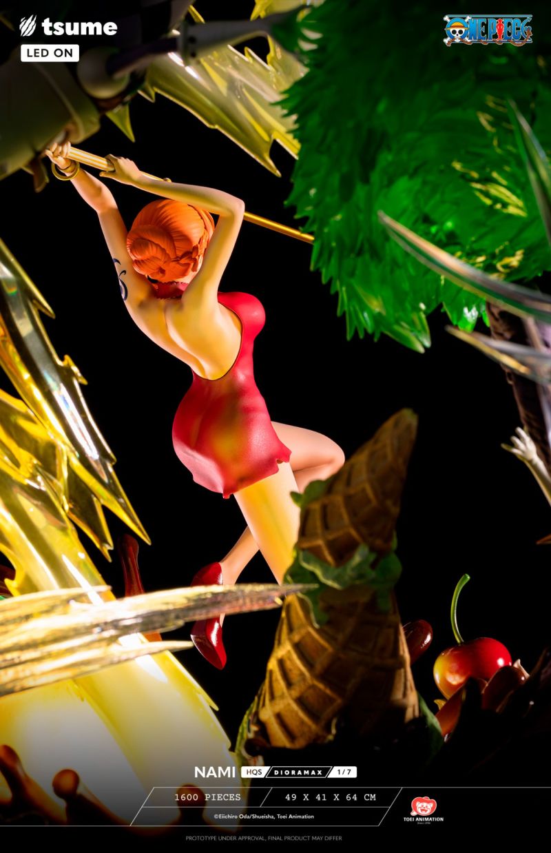 「HQS DIORAMAX 娜美」1/7 比例場景雕像,全尺寸約高 64 公分,將在蛋糕島篇中,娜美手持天候棒,準備利用宙斯發動特大號的雷電攻擊-宙斯風激電飛的場景躍動立體化!身穿一襲性感紅色晚宴服,嶄露娜美豐滿曼妙的好身材、美腋與白皙長腿,盤起的頭髮更顯優雅氣息;底座以誘惑森林為設計,在蛋糕、甜甜圈與巧克力醬中交錯著動感的旋風、閃電特效件,鬼臉樹的葉片被猛烈狂風吹散,BIG MOM手下的象棋兵也全部被打飛得東倒西歪!