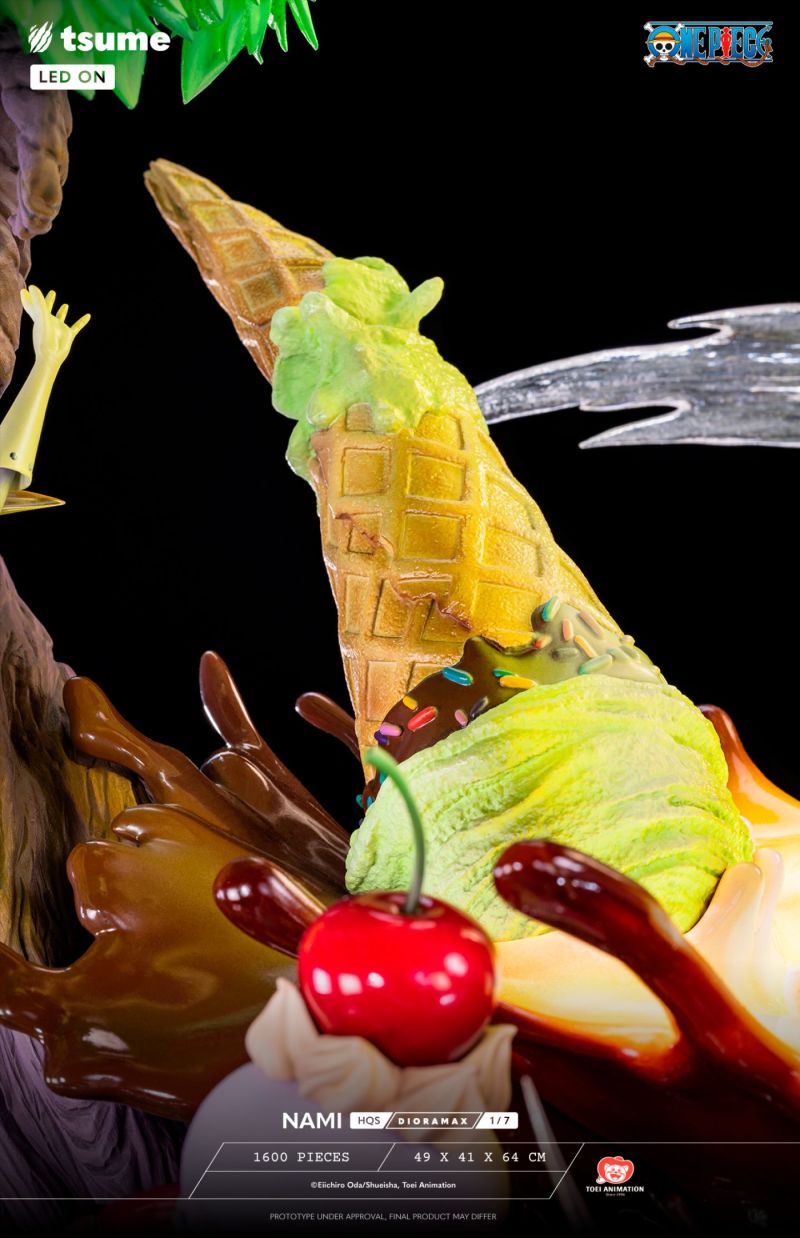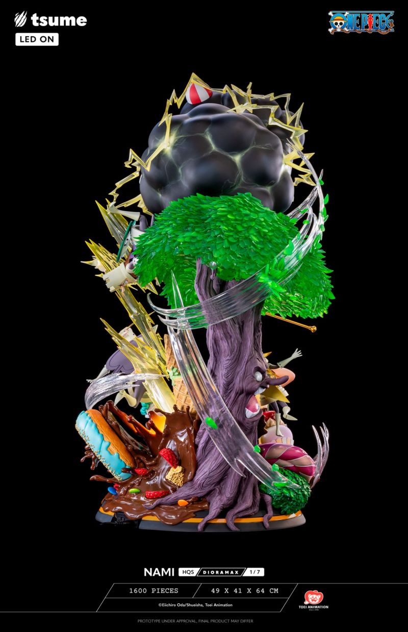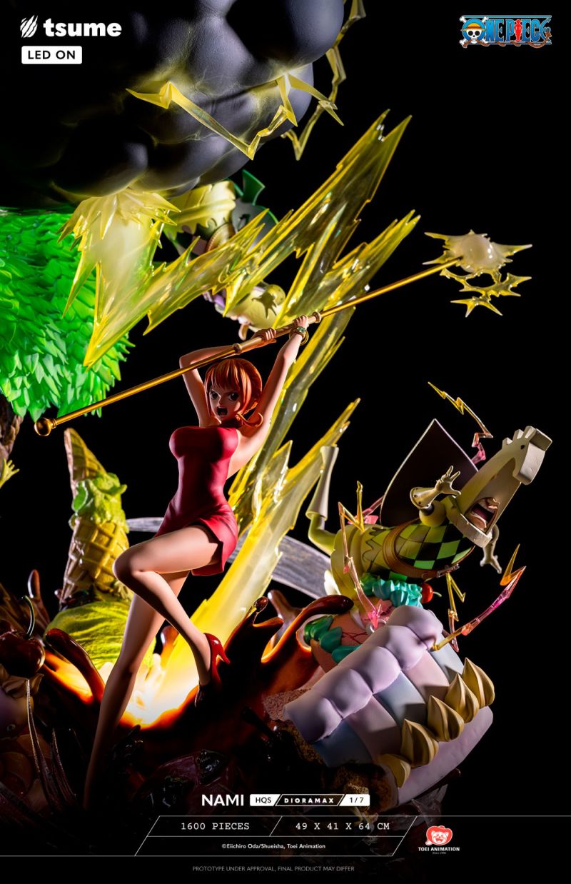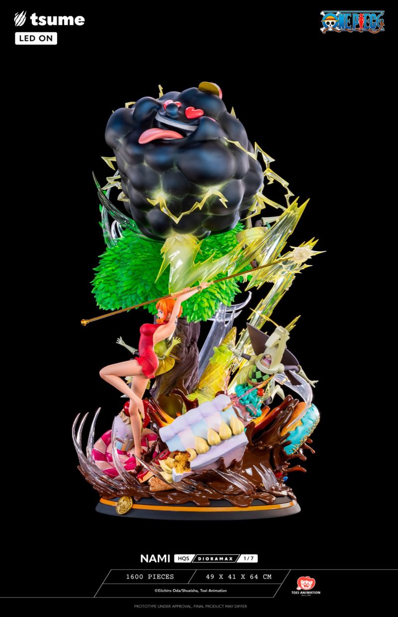 「HQS DIORAMAX 娜美」1/7 比例場景雕像,全尺寸約高 64 公分,將在蛋糕島篇中,娜美手持天候棒,準備利用宙斯發動特大號的雷電攻擊-宙斯風激電飛的場景躍動立體化!身穿一襲性感紅色晚宴服,嶄露娜美豐滿曼妙的好身材、美腋與白皙長腿,盤起的頭髮更顯優雅氣息;底座以誘惑森林為設計,在蛋糕、甜甜圈與巧克力醬中交錯著動感的旋風、閃電特效件,鬼臉樹的葉片被猛烈狂風吹散,BIG MOM手下的象棋兵也全部被打飛得東倒西歪!