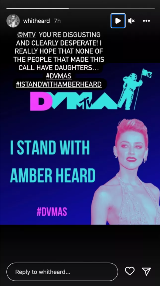 安柏赫德(Amber Heard)的妹妹惠妮亨瑞克茲(Whitney Henriquez)稍早便在她個人 Instagam 的限時動態(上圖)痛批 MTV 節目單位找戴普串場的決定:「MTV 你們真是噁心且沒救了!我真心希望那些做這決策的人都沒生女兒... #我支持安柏赫德。」惠妮的意思可能是指,她認為 MTV 這個節目安排不僅不尊重姐姐安柏,更不尊重其他有遭受家暴的女性,因此覺得那些邀請戴普串場的人根本不配養育女性。