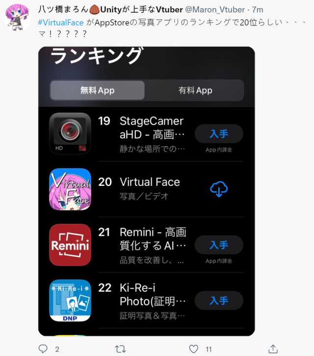 不過八ツ橋まろん也表示,目前還會進行修正,感謝網友測試讓他有更多優化的想法,也希望大家玩得愉快。當然這種套頭的 app,過去也不是沒有過,不過「Virtual Face」才推出沒多久就成為日本寫真類的 app 排行前 20 名,的確是有引起話題 www。或許有興趣的朋友可以試試看,也算是一種有趣的體驗~