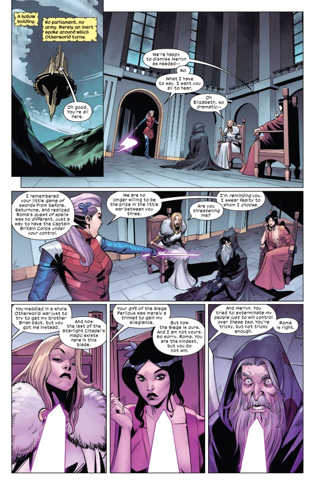 最後,梅林成為了他女兒羅馬與莎特妮恩(Saturnyne)女皇兩人的階下囚,她們重新奪回了異界的統治權——看似如此。但是英國隊長決定不要再讓英國隊長軍團成為她們的工具,打算要脫離他們三人的控制。
