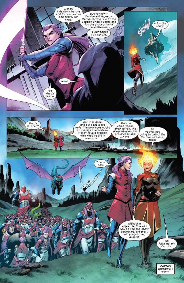 雖然不可能這麼簡單就能殺死他,但是英國隊長還是砍下了梅林的頭!現在手握星光城堡(Starlight Citadel)當中全部的魔法,英國隊長軍團將不再受其他長官的頤指氣使,而自由自在地去保護多元宇宙。