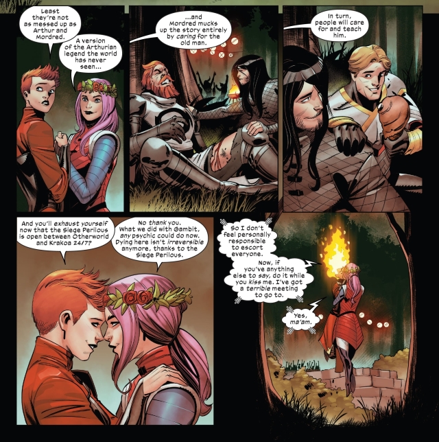 原本以為這段在異界的冒險故事會要再長一些,但是《X騎士團》卻在第五回就結束了。仇恨變種人的梅林勢力遭到瓦解,而且是以相當草率的方式帶過,感覺不免有些敷衍;梅林所統治的國度被羅馬的國度併吞,阿瓦隆(Avalon)則再次成為克拉科的友邦,通往莫凱托的通道也永遠打通了;而英國隊長也正式與瑞秋成為一對,一起率領龐大的軍團守護多元宇宙。
