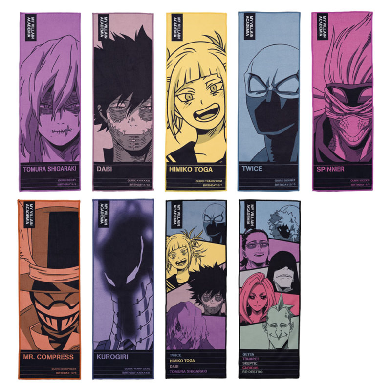 「一番賞 我的 VILLAINS 學院」推出 A~G 與最後一賞、雙重機會賞等 9 個不同級別的獎品,以劇中的反派敵聯為主角,並且皆為高階造型「MASTERLISE」系列,細膩再現精緻的服裝細節,以約 25 公分的尺寸呈現!分別為:A賞「死柄木弔 ; MASTERLISE」、B賞「荼毘 ; MASTERLISE」、C賞「渡我被身子 ; MASTERLISE」、D賞「Twice ; MASTERLISE」,,將角色們邪氣的姿態立體化!