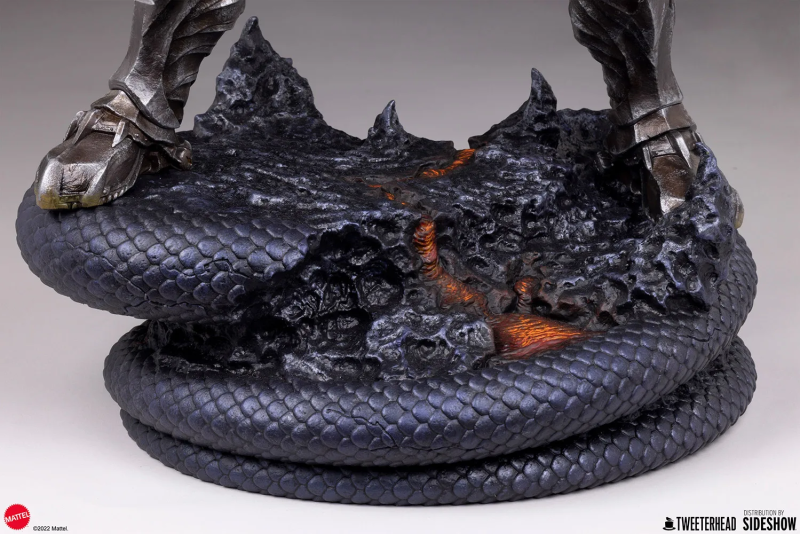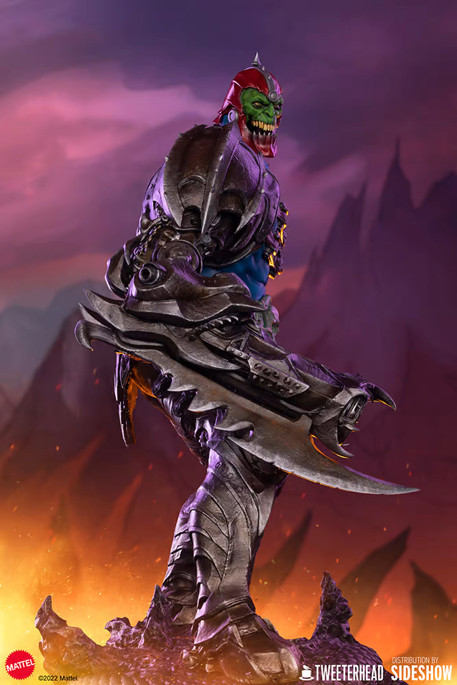 在《太空超人》的故事中,鯊魚嘴與獸人(Beast Man)都是大反派骷髏王(Skeletor)的手下,不過說起這兩位角色,各位玩具人印象最深的可能不是他們做過的壞事,而是他們每每犯錯被骷髏王臭罵一頓,再不然就是被太空超人輕鬆揍飛的滑稽模樣;不過這次 Tweeterhead 冠以「Legends」之名、注入寫實元素重新詮釋的鯊魚嘴可說是相當兇悍!除了桃紅頭盔、綠色頭部、藍色身體的經典搭配之外,整體還施以大量金屬、皮革質地的逼真塗裝,大大提升了視覺上的厚重感。