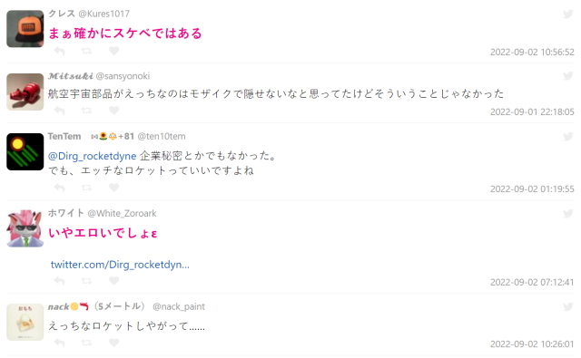 其實影片本身介紹並沒有色色的東西 ( ? ),只是可能因為礙於保密的關係,在火箭的前端放上半透明素材遮蔽,這樣的舉動卻讓部分推特網友想歪,感覺這根粗粗的東西前面上了遮蔽,好像是某種影片的場景 ( 喂 )。