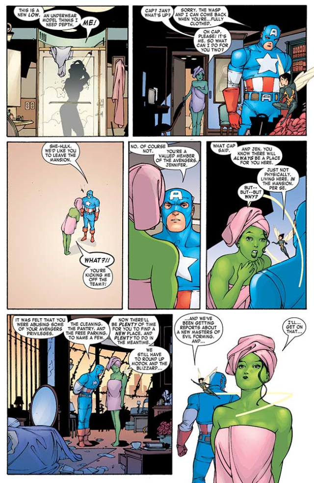 記者追問珍妮佛是不是被復仇者聯盟拒絕,事實上在漫畫中,珍妮佛因為靠著「女浩克」身分沉浸於紙醉金迷的生活方式,因而被美國隊長冷凍。