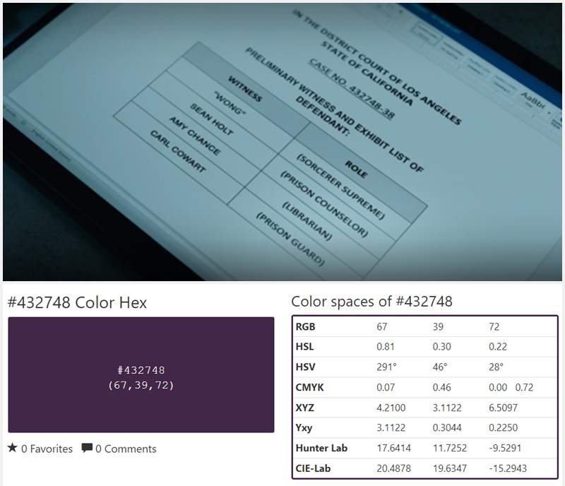 布朗斯基的案件編號為 432748-38 如果你在 十六進制色碼輸入 432748 會得到紫色,也就是浩克褲子的顏色。