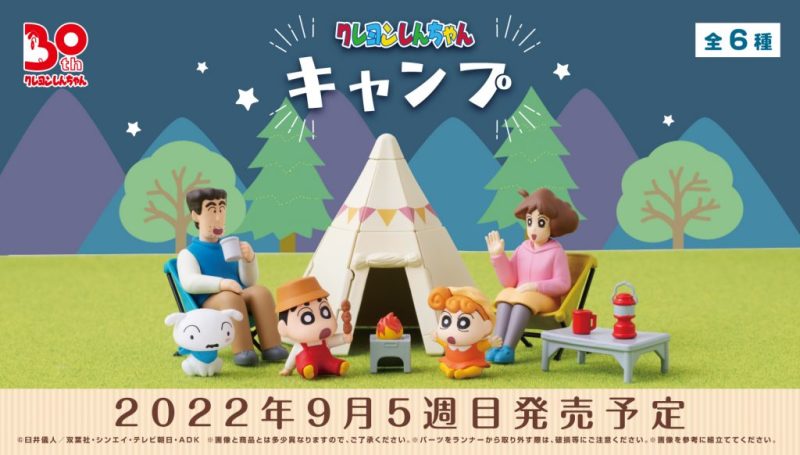 隨著秋天的到來,日本 BANDAI 萬代公司轉蛋事業部「GASHAPON」,將推出以《蠟筆小新》為主題的:「蠟筆小新 露營」轉蛋!一共有六種款式,每轉參考售價為 400 日圓,預計將於 2022 年 9 月下旬發售。