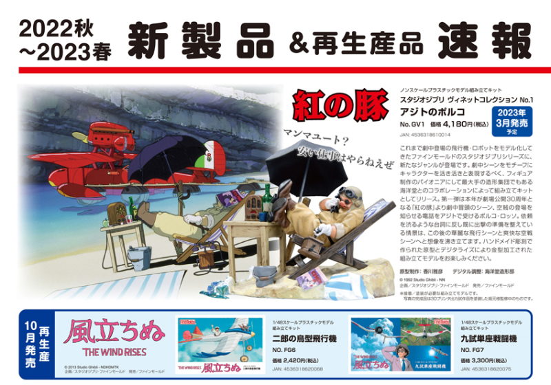 日本組裝模型廠 Fine Molds(ファインモールド),繼人氣的吉卜力工作室的飛行船虎蛾號、天空之城機械兵等商品,睽違多時再全新開發了「vignette collection」系列,首彈推出「 No.1 紅豬 波魯克的藏身之處 GV1(暫譯,アジトのポルコ)」1/35比例組裝模型,參考售價為 4,180 日圓,預計於 2023 年 03 月發售。