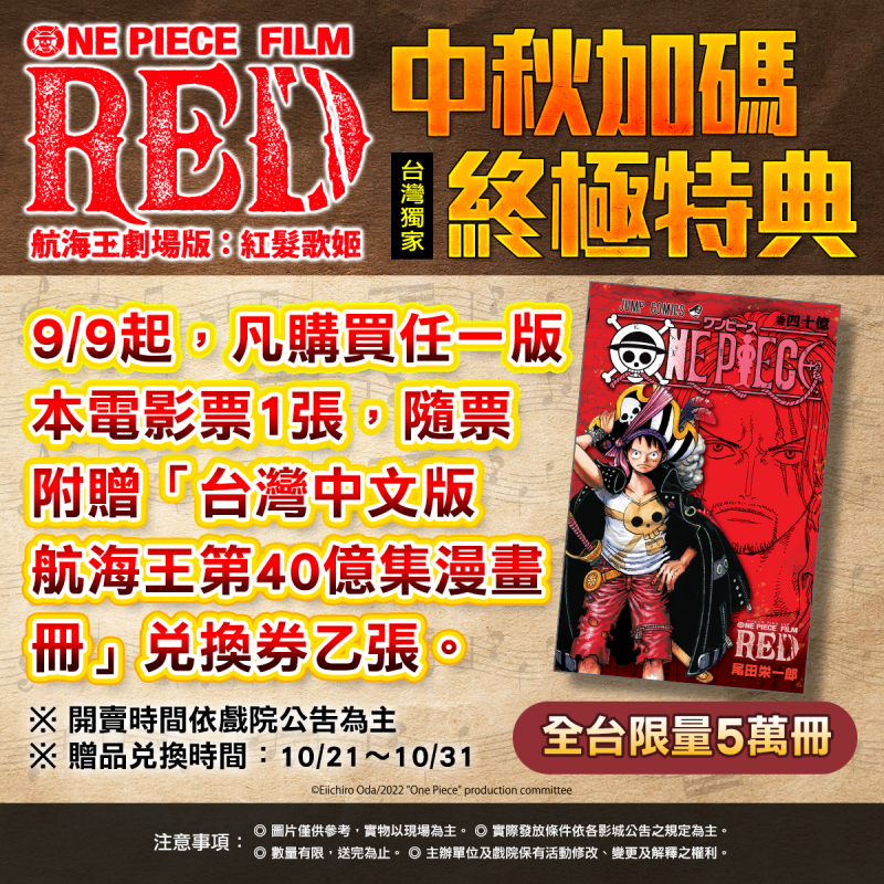 《航海王劇場版:紅髮歌姬》一般數位版、IMAX、4DX、MX4D、Dolby Atmos、Dolby Cinemas版本台灣現正熱映中。還有更多中秋好康活動,詳情請上台北双喜官方社群將有機會獲得限量特典大禮包。
