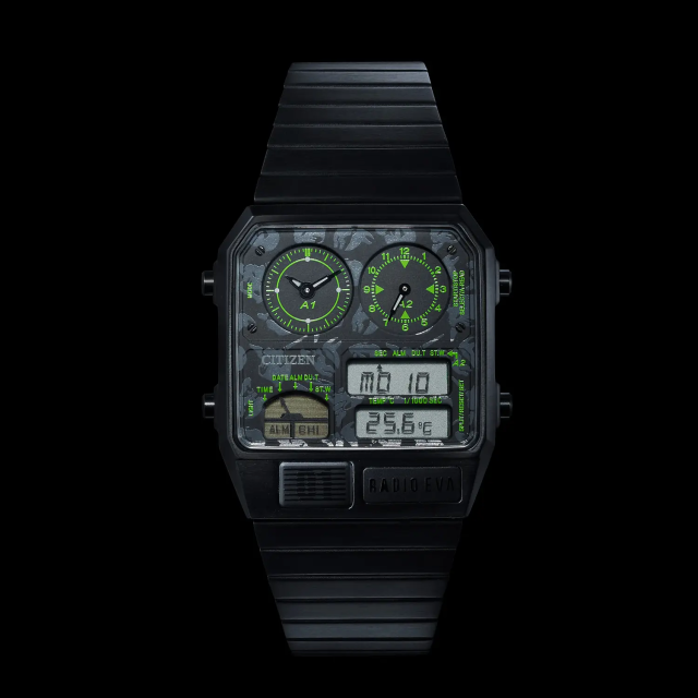 而這次與 RADIO EVA 聯名,整體採用沉穩的黑色為基底,推出了包含初號機配色以及 RADIO EVA 迷彩的樣式。完全沿襲當年的設定,面盤上半部 A1 和 A2 指示盤分別是時分盤和小秒盤,左下角的螢幕可以切換時間、日期、鬧鈴與碼表等功能,螢幕下方的錶殼處有個圓形橫線的面板則是溫度感應器,每隔一段時間就會偵測室溫。