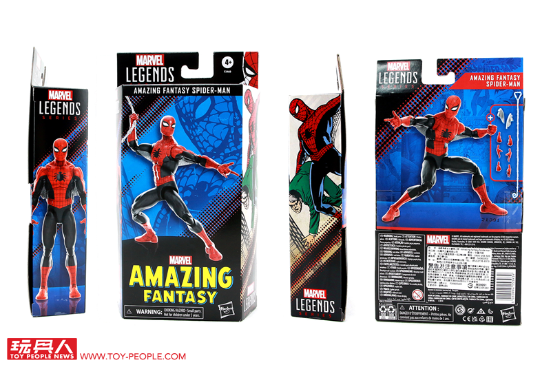 ▼「蜘蛛人(驚奇幻想)」(Amazing Fantasy Spider-Man)。沒錯,作為本篇開箱打頭陣的第一款,當然非這個元祖蜘蛛人莫屬囉!先讓我們看看新包裝的風格,除了人偶的3D渲染照外,外盒兩側分別是人偶本體的正立圖,以及角色的盒繪(元祖蜘蛛人當然就使用了當年的漫畫封面),而背面則清楚列出了各種替換零件與配件,各位在開盒後請務必從紙袋中確認是否有漏喔!