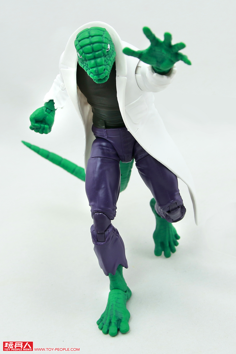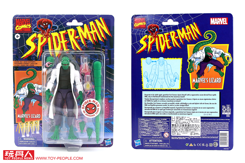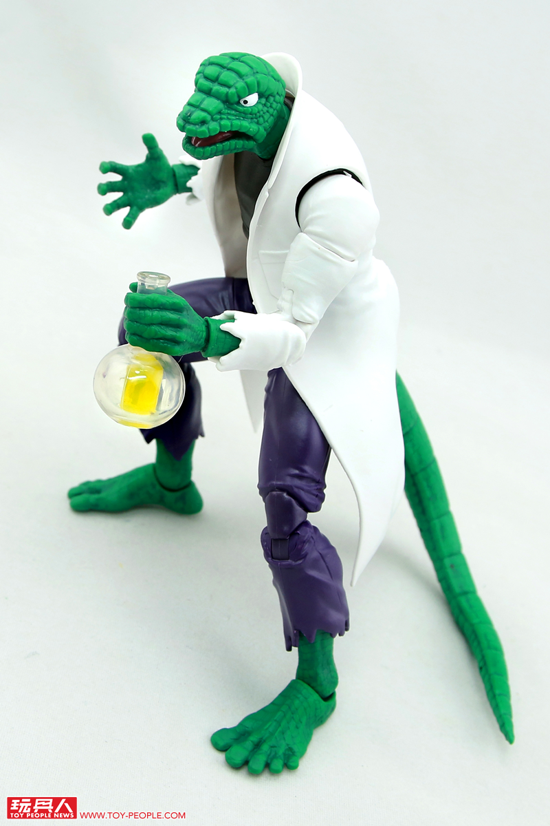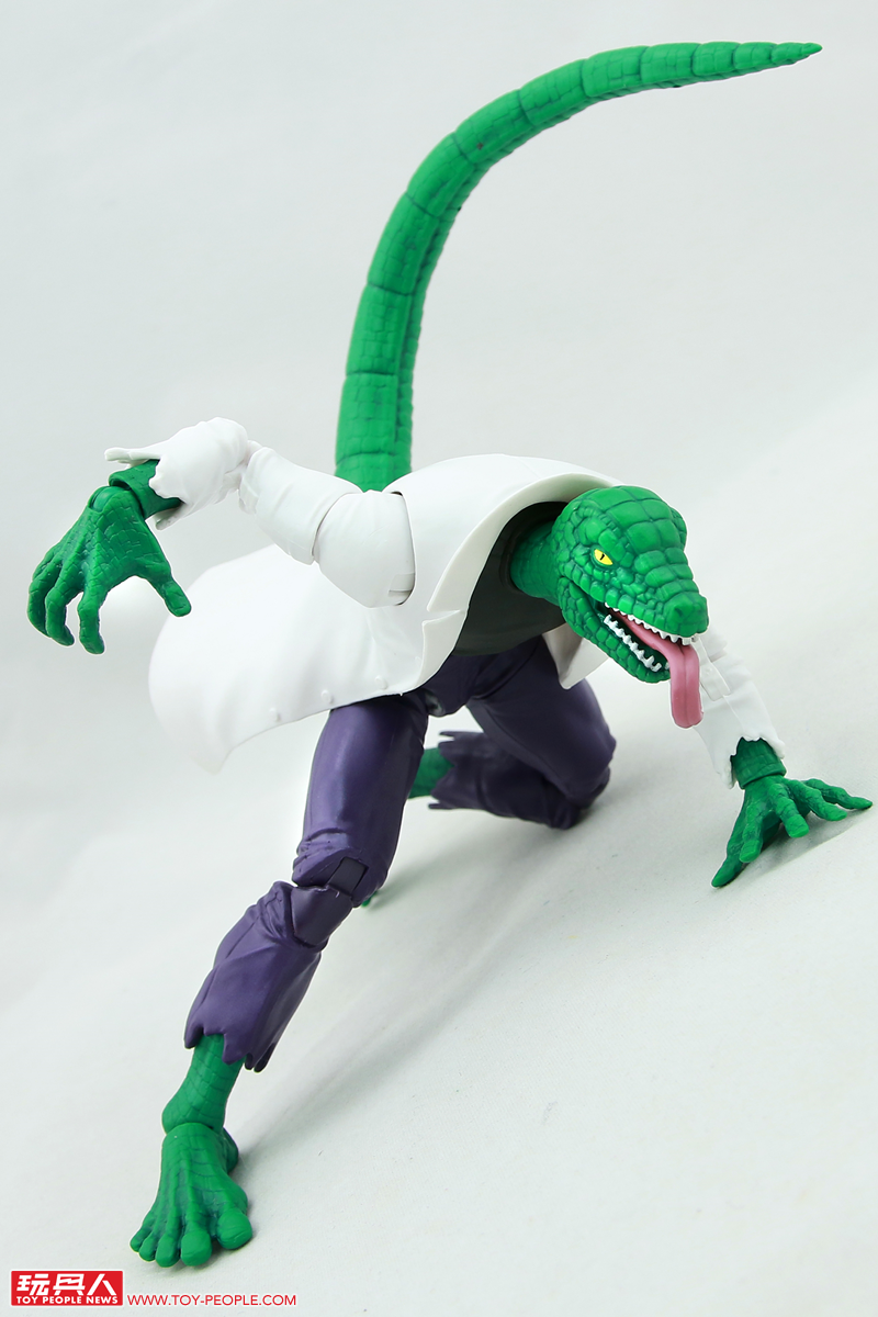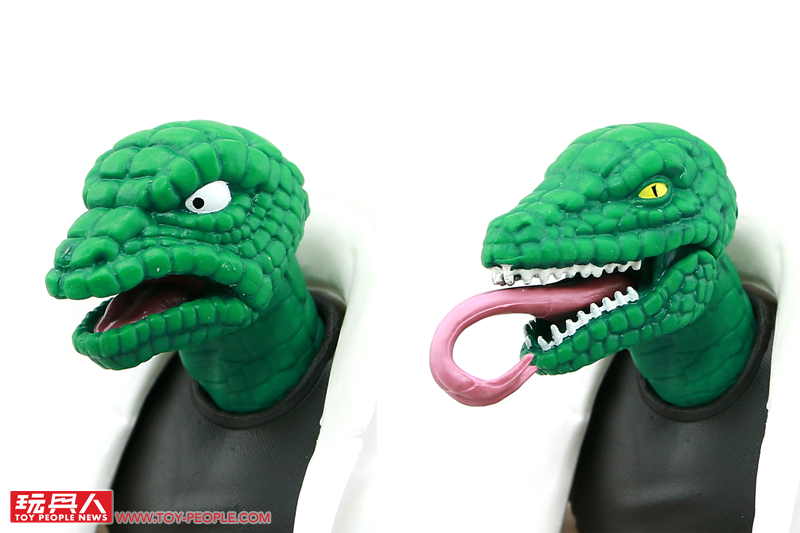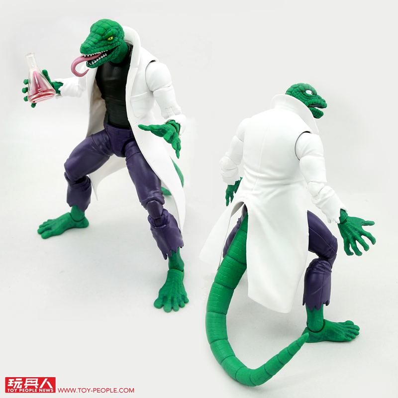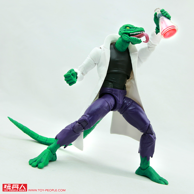 ▼本次的復古吊卡版,實際上是取材自1994年的蜘蛛人動畫系列(Spider-Man: The Animated Series)第一集「蜥蝪之夜」(Night of the Lizard),重現了蜥蝪人登場的樣貌,並附屬了雙頭雕、兩對手型,以及兩種不同的燒瓶,值得一提的是,尾部是以軟膠內包軟鐵絲的形式,因此可以在一定的限度下自由變更尾巴的角度。。