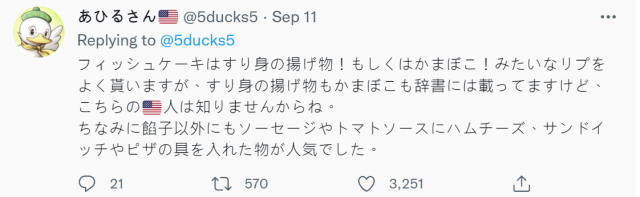 推主也表示,其實魚糕 ( フィッシュケーキ ) 在美國當地也非常有人氣,搭配各種配料都很好吃。不過有些人他跟炸魚排搞錯,其實滿讓人頭痛的。