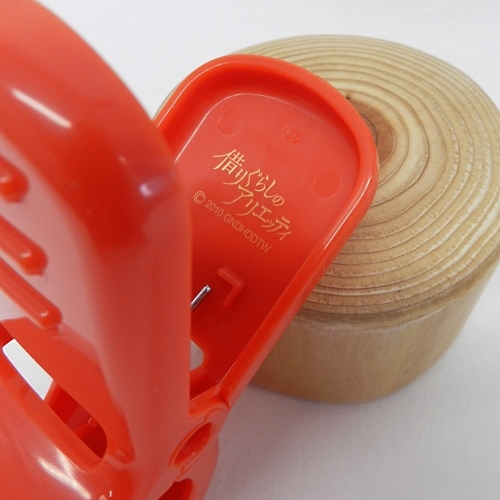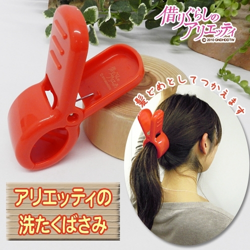 「艾莉緹的曬衣夾」,將劇中艾莉緹首次出任務時用來把頭髮束起來的曬衣小夾子以人類尺寸呈現!還原紅色的鮮豔配色,設計為可愛的曬衣夾造型髮夾~乍看只是紅色夾子,但在內側有印上燙金的《借物少女艾莉緹》字樣,可以用來增加粉絲信仰~(這樣也可以?)