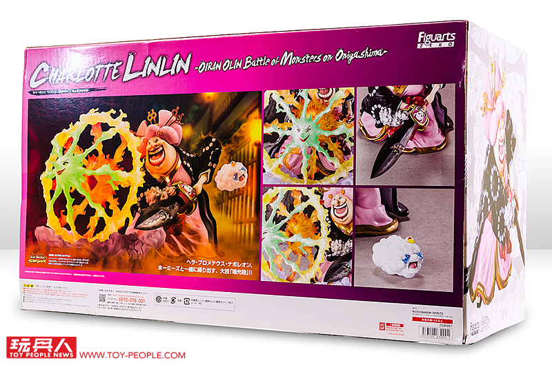 ▼ 整體外盒設計風格與過去商品相去不遠,採用表現和之國篇風格的潑墨結合代表 BIG MOM 的粉紅色調,而透明的開窗設計更是一口氣開了兩窗,除了讓消費者能夠清楚盒內模型的狀況,也展現這款商品有多巨大,透明膠膜上還印上漫畫裡常見的「咚!!!」狀聲詞,還沒拿出來就很有魄力!