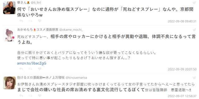 但事實上這款「淨化鹽噴霧」是可以在網路上購買的,趣味的設計與噱頭宣傳,也讓不少網友使用在自己身上感覺到心情好轉,有種撫慰心靈的感覺。不過卻有網友表示,用來噴灑在討厭的上司 ( 或人 ) 所使用的錢包或物品,可以驅離他們或詛咒他退休,變成一種驅小人的功用,而這個無根據的說法也在推特上傳開。