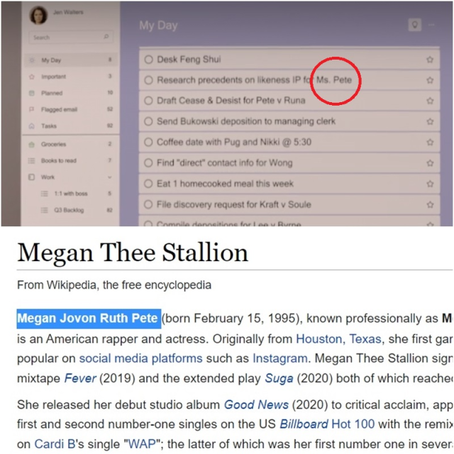 珍妮佛電腦裡其中一個待辦事項,是處理 Ms. Pete 的業務,而上一集的嘉賓 梅根尤物 本名就是 Megan Jovon Ruth Pete,看來她也要控告阿斯嘉精靈露娜冒充其身分了。