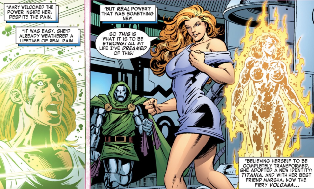漫畫中 Mary Macpherran 原本是個骨瘦如柴的女孩,總是被其他同儕欺負,嚮往著超級英雄般的能力。 偶然的機遇下,她欺騙自己的朋友自己就是「蜘蛛女俠」的真實身分,豈料不久後他們捲入了「蜘蛛女俠」的戰場,謊言不攻自破。落荒而逃之下遇見了「末日博士」,「末日博士」給了她強大的超能力,讓她加入自己的犯罪帝國。