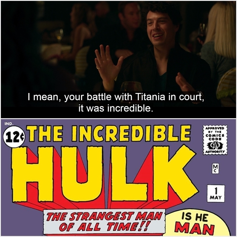 這位和女浩克約會的男子,用「無敵」(Incredible)來稱讚女浩克,這個字當然就是致敬浩克漫畫原作《無敵浩克》(Incredible Hulk) 了。