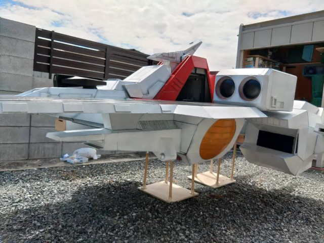 由於整體尺寸非常大,全長約 4 公尺、高也有 1.5 公尺左右,在家戶外組裝時也十分辛苦,可以看到光是部分零件就快跟一台汽車差不多大了。