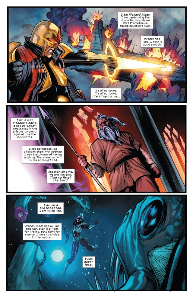 新星(Nova)正在捍衛著太空港的群眾,一如往常地把責任都攬在自己身上;神祕的「漁王」(Fisher King)沒有姓名、沒有「武器」,什麼都沒有。但是他與另一人會合後,即將去帶來第三人;不敗者伊絲卡(Isca the Unbeaten)還在水中大戰魚類,因為戰役的結果仍會是烏拉諾斯的勝利,於是她被自己的武器所迫為他而戰,她永遠不敗。