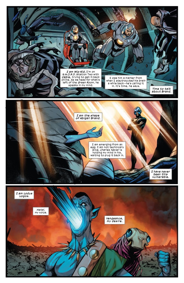 位於天劍局(S.W.O.R.D.)被毀太空站的Wiz-Kid與鎖鏈(Cable)逃出生天,並加入了暗中對抗阿比蓋爾‧布蘭德(Abigail Brand)的聯盟;前一期被烏拉諾斯殺死,正在被復活的阿比蓋爾本人的意識還在X教授的腦中,正準備被灌回身體裡;而巨輪議會的羅德斯‧邏各斯(Lodus Logos)正在用他創造金屬的詩歌與萬磁王合力迎戰烏拉諾斯的死亡機械們。