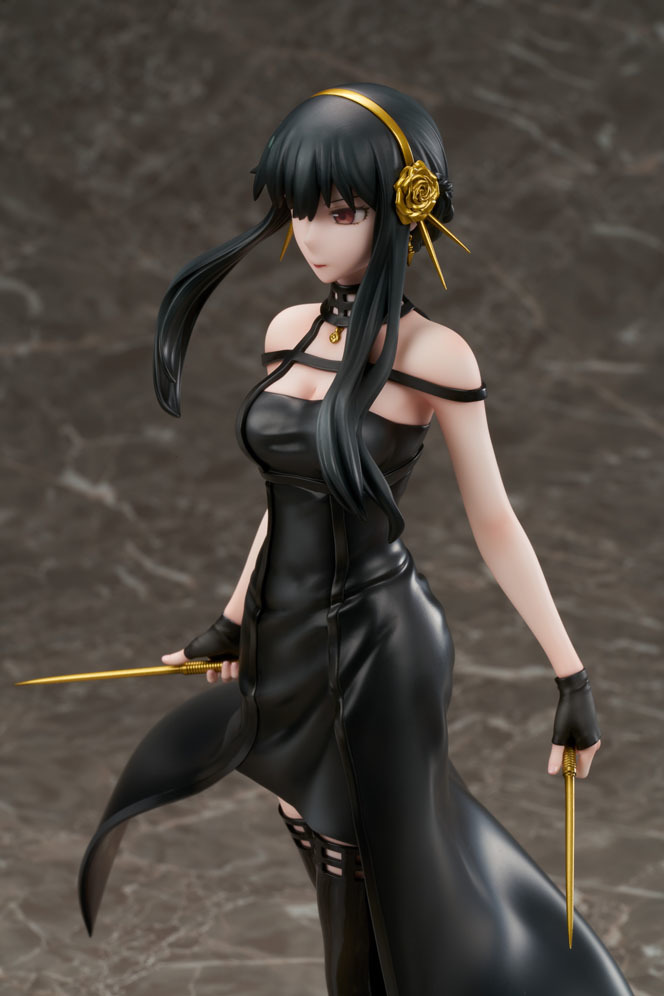 「F:NEX 約兒・佛傑」1/7 比例模型,尺寸全高約 25 公分,以約兒擔任殺手時身穿的睡美人黑色禮服為造型,貼身的設計仔細地展現了纖細而姣好的身材曲線,性感露出的肌膚施以柔軟的膚質塗裝,黑色長靴則是有琺瑯般的光澤感、配件的金飾點綴著高雅,在各細節處講究地呈現出各質感的差異。雙手的招牌武器 Stiletto 與臉上優雅卻藏有殺戮的神情呼應,展現令人毛骨悚然的銳利和美麗!