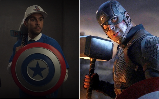 帕格買了山寨的美國隊長盾牌和雷神之槌,這個組合顯然致敬了《終局之戰》中拿起雷神槌的隊長。