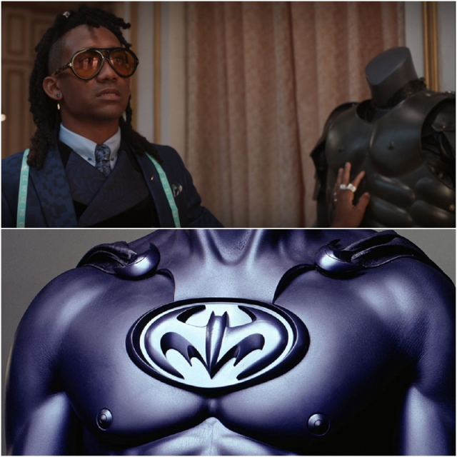 這套凸顯了乳頭的緊身服裝,顯然惡搞了喬治克隆尼最痛恨的黑歷史:1997 年《蝙蝠俠4:急凍人》的乳頭服裝。