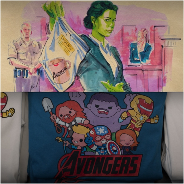 在每集的片尾動畫中,都有出現女浩克拿著山寨版「Avongers」馬克杯的證物,到了這集終於揭曉。原來是好友妮琪決定幫「女浩克」訂製一套英雄服裝,沒想到遇見私賣山寨貨的店家。有趣的是這些Q版「復九者聯盟」其實也是 100% Soft 的設計風格~