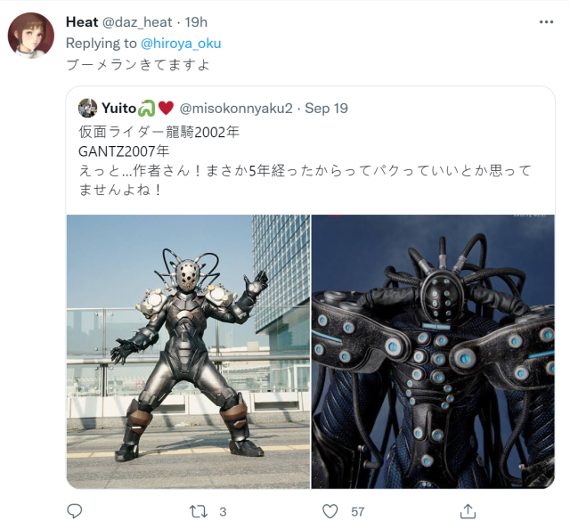奧浩哉也就直接點名假面騎士的製作人「現在播的假面騎士的製作人,該不會認為GANTZ的著作權消失了吧(笑)」,雖然沒有直接說對方抄襲自己的作品《GANTZ》,但這樣的說法也已經很明確感受到他的不悅。
