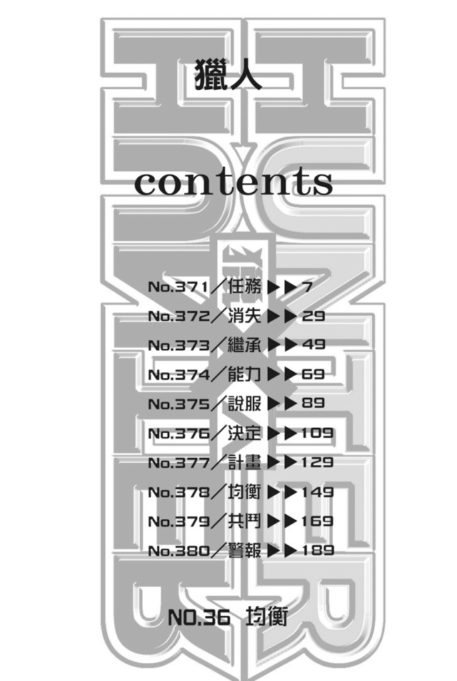 有鑑於《HUNTER×HUNTER》第36卷單行本所收錄的內容是從第371話至第380話,而停刊的話數又是落在第390話,因此在第37卷內容也是從第381話開始一直到第390話結束。