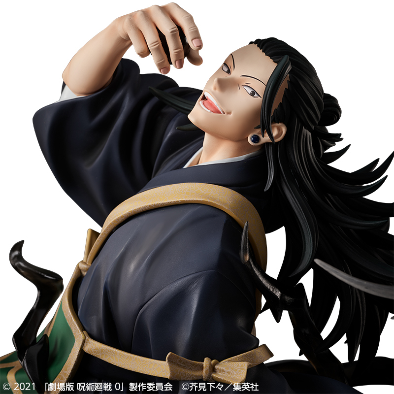 「劇場版 咒術迴戰 0 夏油傑」1/4 大比例模型,尺寸全高達壓倒性的 50 公分,以劇中令人印象深刻的場景為靈感,再現夏油傑手握咒靈球黑玉並露出狂妄笑容的造型。。採用黑色的透明特效件還原咒力繚繞四周、充滿邪氣的流動感,飄逸袈裟施以精美塗裝,展現強烈氣勢!額頭尚未有縫合痕跡,高仰的頭部搭配準備要把黑玉吞下的動作,手指筋肉線條等細節也仔細重現,「臣服於我吧,猴子!」