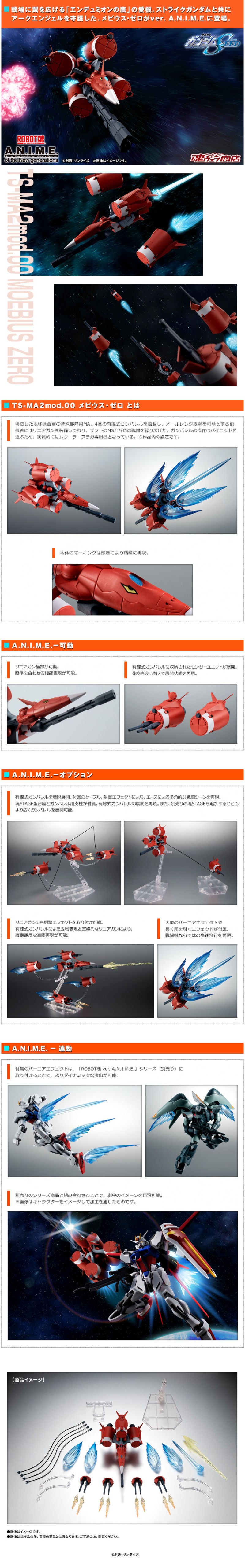 「ROBOT魂 <SIDE MS>TS-MA2mod.00 梅比烏斯 零式 ver. A.N.I.M.E.」,徹底再現洗練且具備機能美的裝甲造型,整體可動關節經過嚴密的設計,機頭配備了線性槍,透過電纜連結與支架來部屬 4 個線控式炮筒特徵造型,能夠獨立活動並進行全範圍攻擊!使用替換零件方式再現展開狀態,並配備有豐富的特效零件,包含磁軌砲以及長推進噴射特效零件,再現強力砲火的姿態。