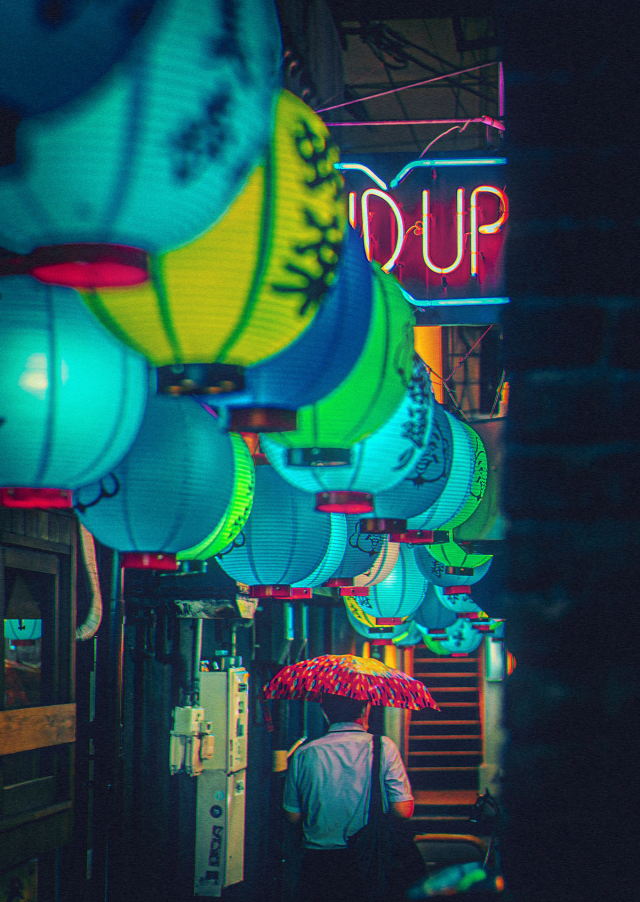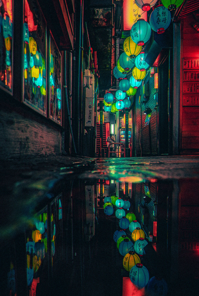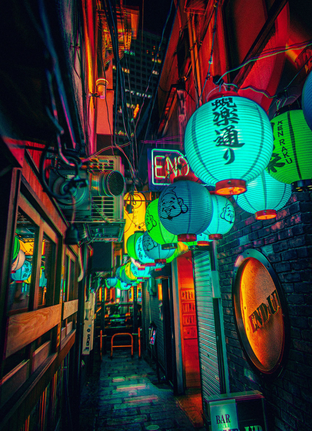 キツネツキ(@AzureFox13)在大阪的北新地‧蜆樂的街區看到如同「異世界通道」或「賽博龐克」的場景,那邊多半為居酒屋和酒吧,店面掛著青色、黃色的燈籠外加一些絢麗的霓虹燈,多彩的燈光配上潮濕的地面,再加上看不見群星的夜空,彷彿這裡像是「未來的日本街區」一樣,十分有趣。