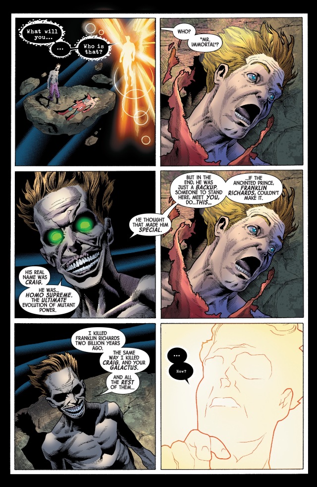 但是,不但他其實只是個替代品,以免真正的天命之子富蘭克林‧理查茲(Franklin Richards,神奇先生與隱形女的兒子)沒能活到宇宙盡頭,甚至他其實還能被遭到「至下存在」(The One Below All)附身的布魯斯‧班納(Bruce Banner)殺死......