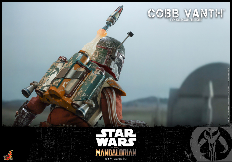 於《曼達洛人》第九章:執法官(Chapter 9: The Marshal)登場的「柯布·范思」是位於荒漠當中的小鎮摩斯培爾戈(Mos Pelgo)的執法官,從爪哇族那裡買下原屬於傳奇賞金獵人「波巴·費特」的盔甲後,便穿著它守護此地的秩序;本次 Hot Toys 即是以此為題推出 1/6 比例的柯布·范思,再現了他身穿的紅褐主調服裝與套在外頭、經過重度戰損處理的波巴·費特頭盔與護甲,整體充分再現了演員 Timothy Olyphant 於劇中的高瘦身形,頭雕部分的輪廓形塑、神態與頭髮的還原都十分不錯。