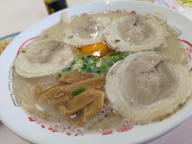 由於福岡縣就在九州一帶,該地最具盛名的就是「博多拉麵」,而博多的特色就是乳白色的豚骨白湯。所以在該地,只要講到拉麵,沒特別指定的話就是豚骨拉麵,菜單上寫著拉麵就是豚骨口味的無誤。