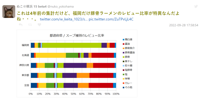 也有網友列出四年前的統計圖表,可以看到福岡縣對比其他地區,豚骨的比率真的異常的高。( 也可以看出各地喜好的不同 )