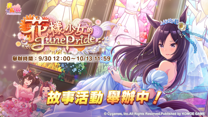 「漂亮夢想盃」——這是能在競賽中身穿一流設計師設計的決勝服【婚紗】,展現自我魅力的表演活動。重砲、氣槽等人各自懷有不同的動機,成為服裝模特兒兼參賽者,參加了這場決定誰才是「謬斯」的甄選,不遺餘力地爭奪勝利……9月30日至10月13日,遊戲内將舉辦故事活動「花樣少女的JunePride」!訓練員透過累積活動Pt,就能開放活動限定的精彩故事。
