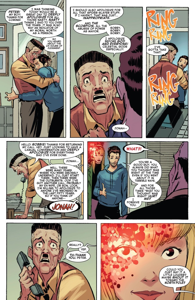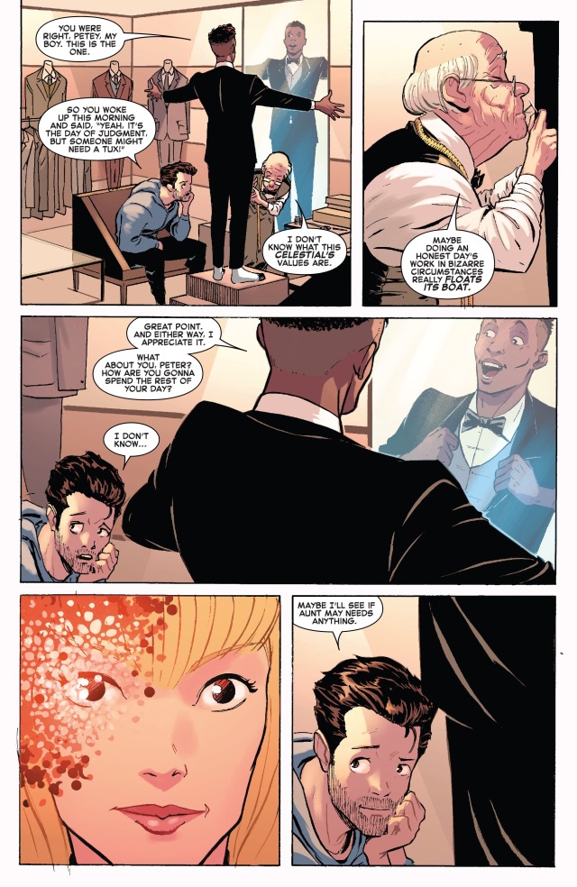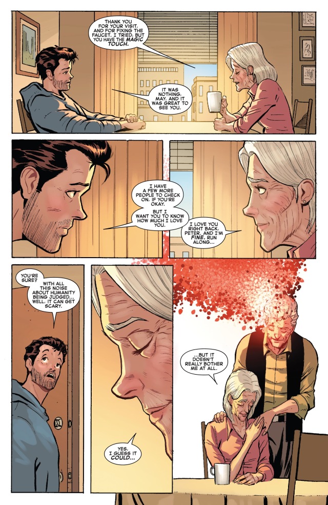 下一站是去拜訪梅姨(Aunt May)看她最近過得好不好,尤其是在現在這24小時的審判日之下。但是梅姨表示自己其實並不因為這件事情而感到多憂心——因為她的審判者正是她死去已久的丈夫班‧帕克(Ben Parker),即使是以這種奇怪的狀況現身也算是終於讓他們夫妻重逢了。