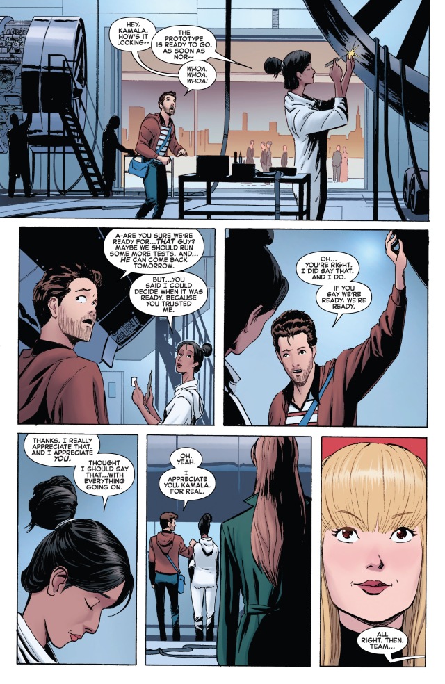 到了最後,他終於來到自己現在上班的公司,遇到了實習生「驚奇女士」(Ms. Marvel)的祕密身分卡瑪拉‧可汗(Kamala Khan)。目前為止都沒有問題,只不過......
