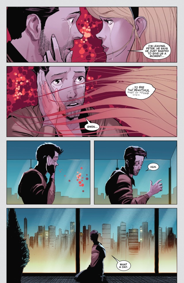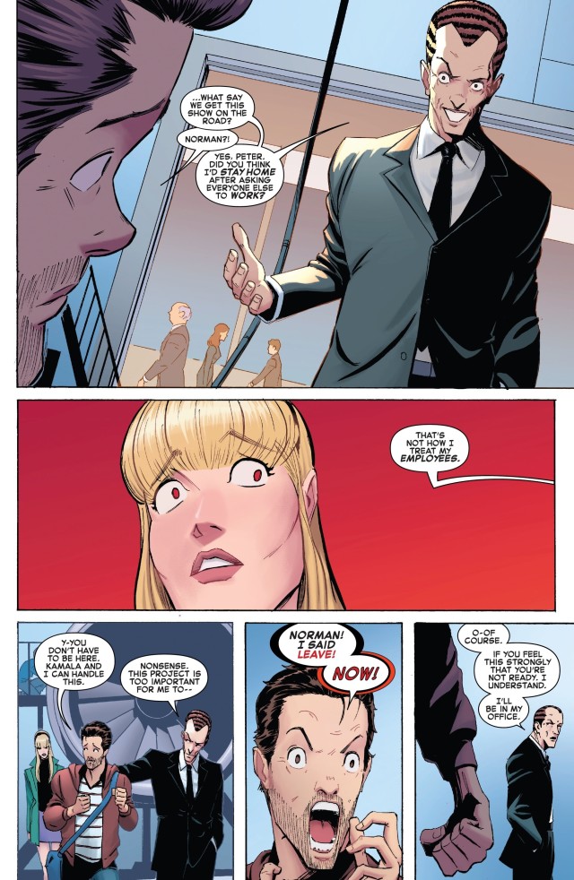 這可是諾曼‧奧斯朋(Norman Osborn)的公司,也就是當年化身綠惡魔(Green Goblin)把關從高樓上摔下去殺死了她的兇手。而「關」發現了這件事情,顯然非常震驚!彼得也知道這一點會發生,原本並不想到公司來,卻因為沒能拒絕諾曼而還是導致了這場相遇。