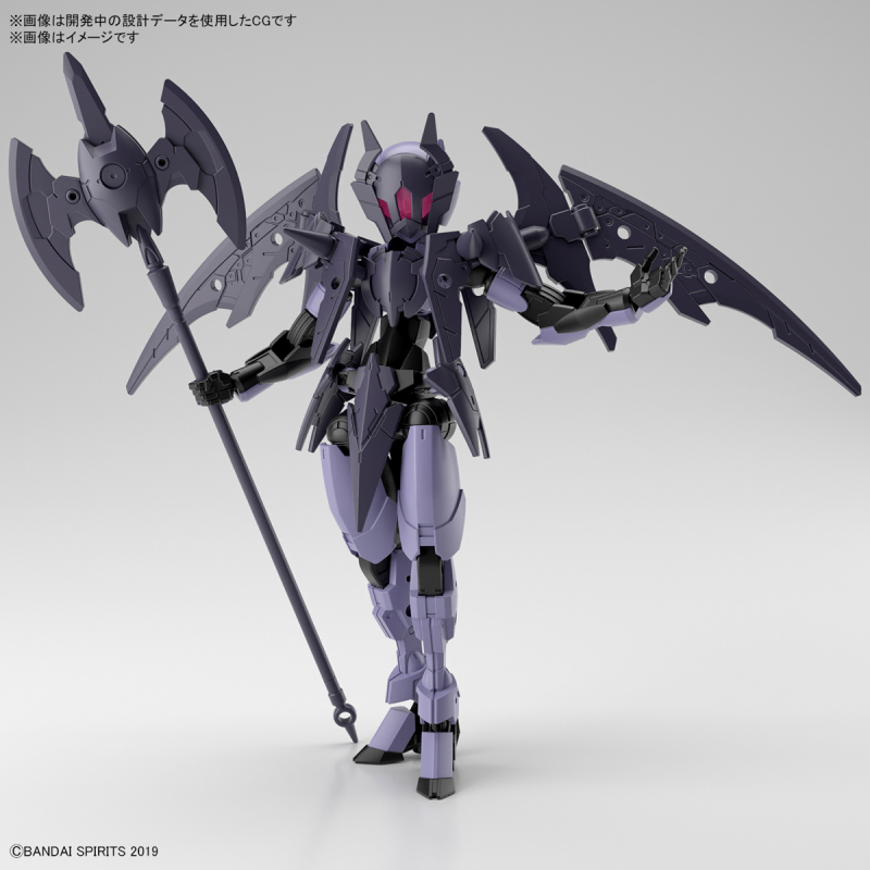「30MM 1/144 EXM-E7r 司比納帝亞 (死神規格)」延續過去推出的司比納帝亞素體,並使用部分新規零件再現手持戰斧、搭載惡魔翅膀般背包的姿態,素體與裝甲可自由組合與拆卸,戰斧則能將斧刃拆下變為長槍形態。套件沒有使用卡榫密合的內嵌式設計,更加提昇可動範圍與組裝方便性。全機採用共通規格 3mm 卡榫能與運用另售的 30MM、30MS 系列零件進行改裝。