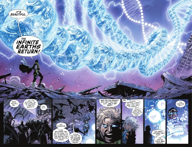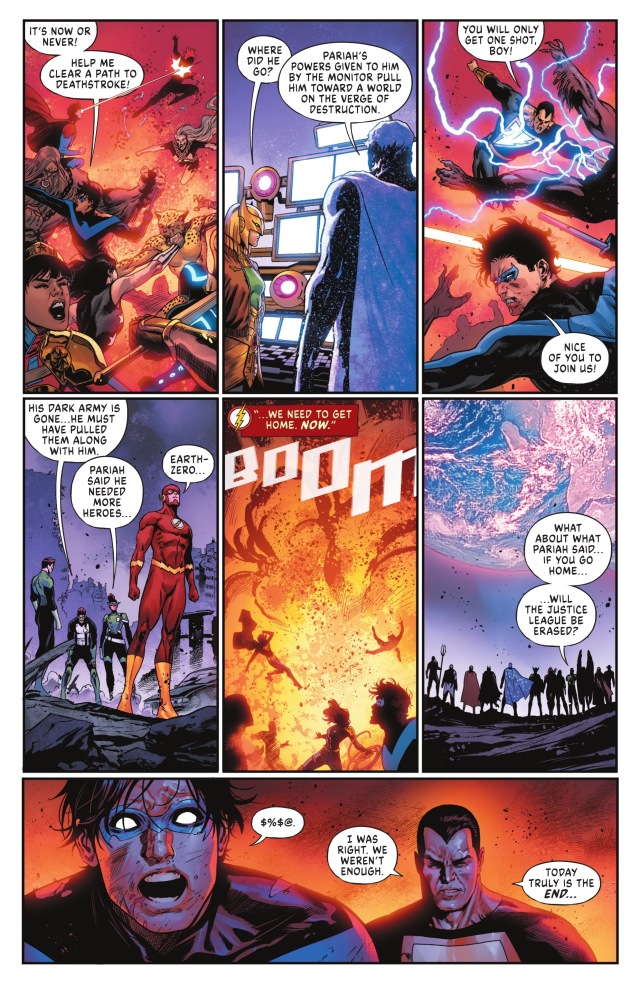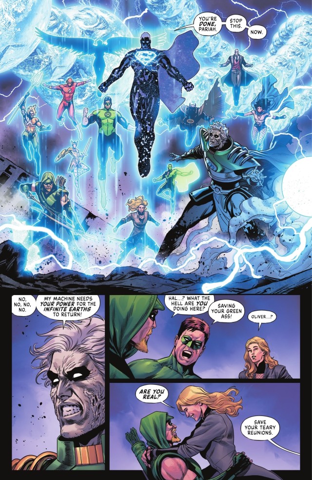 在賤民(Pariah)這邊,無限地球終於在他的眼前展露出來。兩位綠光戰警(Green Lantern)敗在他的手下,而他正等著正義聯盟在各自的虛假的世界中重聚。